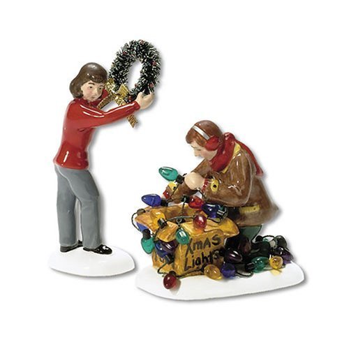 "More Decorations?" is a ceramic accessory that coordinates with "The Noel House" (item number 56.55341). This 2 piece set features a woman ready to hang an evergreen wreath while a man sorts through a box of Christmas lights. The Original Snow Village Collection is designed and manufactured exclusively by Department 56.