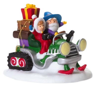 "Road Trip!" is a detailed figurine that is designed to coordinate with "Santa's Hat Inn" (item number 56.56795). The porcelain accessory features two elves ready for a vacation with a fully packed snowmobile. The North Pole Series is designed and manufactured exclusively by Department 56.